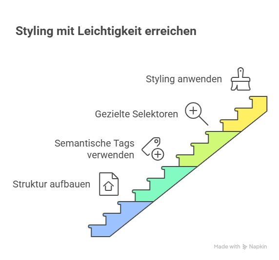 Aber weil du die vorherigen drei Schritte gemacht hast, ist Styling jetzt deutlich einfacher. Die Struktur steht, die Tags sind semantisch korrekt, und du hast ein klares Selektoren-System.