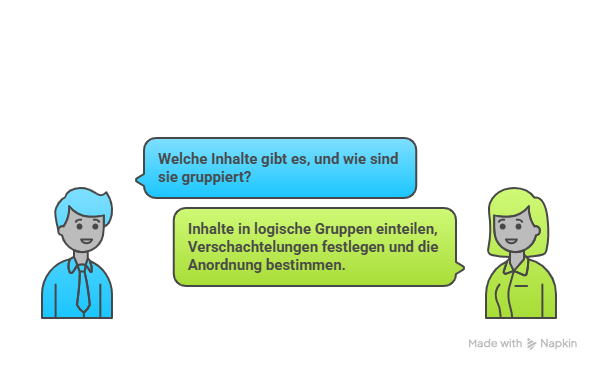 - Inhalte in logische Gruppen einteilen (Header, Hero, Content-Bereiche, Footer)