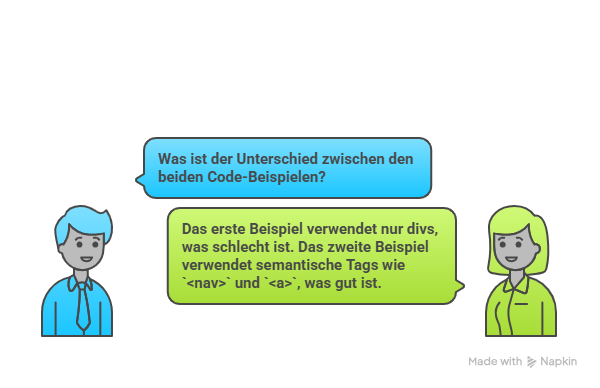 Beide sehen im Browser gleich aus. Aber die zweite Version sagt dem Browser: “Das ist eine Navigation.” Ein Screenreader kann Nutzern direkt zur Navigation springen lassen. Google versteht die Seitenstruktur besser. Und ein anderer Entwickler sieht sofort, was dieser Code-Block tut.