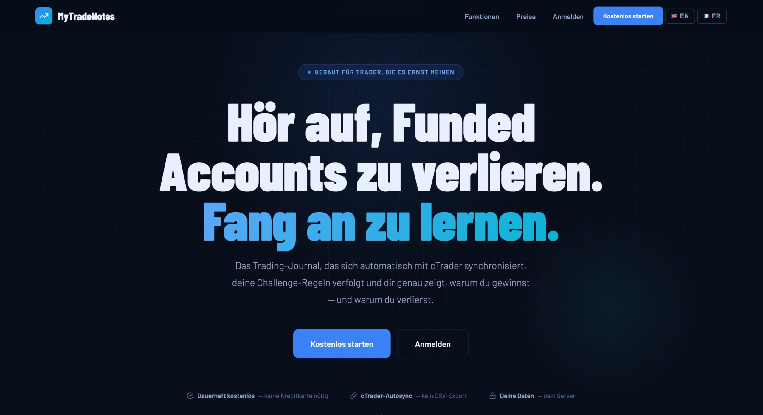 SaaS-Plattform für Trading-Journaling mit automatischer cTrader-Synchronisation, tiefgehenden Statistiken und interaktiven Charts. In unter einer Woche vom Konzept zum MVP – entwickelt mit KI-gestützt